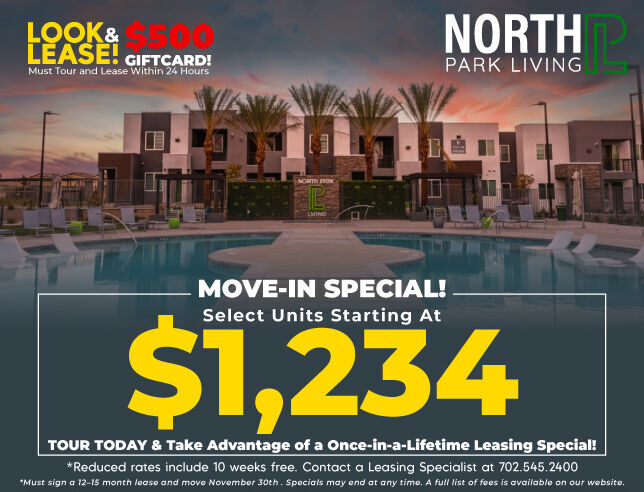 At North Park Living, our 1, 2, and 3-bedroom apartments in North Las Vegas have what it takes to transform your lifestyle. No matter which floor plan you select, you can count on the latest smart-home technology to keep your days running smoothly. Your contemporary kitchen with quartz countertops elevates every cooking experience, while your in-home washer and dryer set makes doing laundry much less of a hassle. Each home also includes expansive walk-in closets, so you won’t have to worry about running out of storage space.